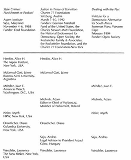 این جدول شامل شرکتکنندگان سه کنفرانس است که به مسائل عدالت در دورههای گذار پرداختهاند. در بخش نخست جدول، افرادی را مشخص کردهام که در بیش از یکی از این کنفرانسها حضور داشتهاند. در بخش دوم، همه افراد دیگر را فهرست کردهام.