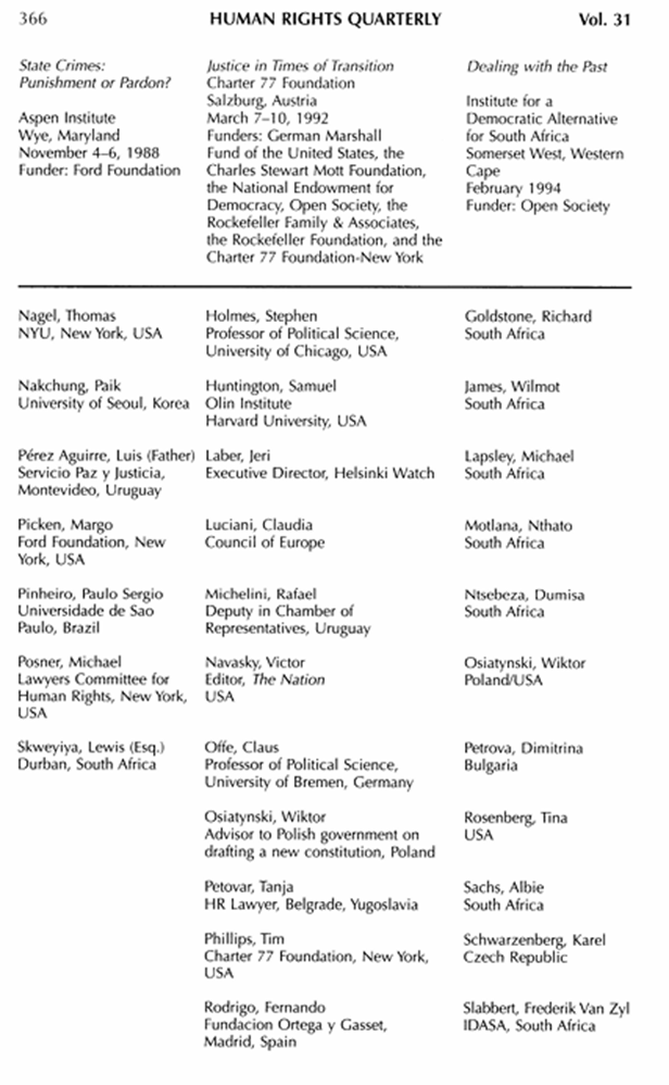 افرادی که هِنکین گرد هم آورد، تجربهها و توانمندیهای متنوعی داشتند. لارنس وِشلر که دربارهی این کنفرانس در مقالهای در ۱۹۸۹ در نیویورکر دربارهی سرکوب و مصونیت در اروگوئه و همچنین در ۱۹۹۰ در پینوشت کتاب خود «یک معجزه، یک جهان» نوشته بود، حضور داشت. فیلسوفانی مانند رونالد دورکین (Ronald Dworkin) و توماس نِیگل (Thomas Nagel) نیز حاضر بودند. هر دو قبلاً بخشی از گروه پنجنفرهی فیلسوفانی بودند که کارلوس نینو در آوریل ۱۹۸۶ (با حمایت مالی بنیاد فورد) به آرژانتین دعوت کرده بود تا دربارهی سیاست حقوق بشر با او و خایمه مالامود-گوتی گفتوگو کنند.[۹۰] نِیگل در همین کنفرانس تفاوت بین «دانستن یا شناخت» و «بهرسمیت شناختن»، که در حال حاضر بسیار شناختهشده است، را مطرح کرد. [به این معنی] که «بهرسمیت شناختن» اهمیت شناسایی رسمی و عمومی حقایق دربارهی جرایم گذشته را نشان میدهد.[۹۱] همچنین دانشمندان علوم سیاسی مانند محمود ممدانی (متخصص آفریقا)، مارگارت کراهان (Margaret Crahan متخصص آمریکای لاتین) و ساموئل فیچ (Samuel Fitch متخصص روابط مدنی-نظامی) شرکت داشتند. رهبران مذهبی هم مانند پدر لوئیس پرز آگیره (Luis perez Aguirre) که نوشتهی وِشلر درباره او در کتاب «یک معجزه، یک جهان» مشهور است، حضور داشتند. شخصیتهای برجسته دیگری مانند دایان اورِنتلیکر، پائولو سرجیو پِنیّرو (Paulo Sergio Pinheiro)، تئودور مرون (Theodore Meron) و هوگو فرولینگ (Hugo Fruhling) نیز شرکت داشتند.