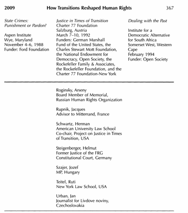 تمرکز فعالیتهای حقوق بشر بیشتر بر تخلفات جاری بود و بهندرت به خشونتهای گذشته یا جلوگیری از تکرار موارد نقض [حقوق بشر] میپرداخت … اما از دههی ۱۹۸۰، این سازمانها مجبور شدند توجه بسیار بیشتری را به مسائل حقوق بشری مرتبط با گذارهای سیاسی معطوف کنند.[۴۹]